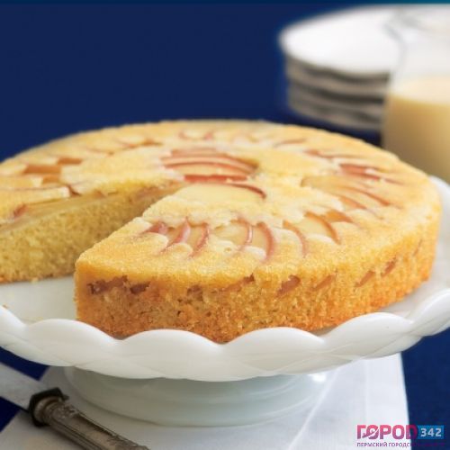 Выложите яблоки так, чтобы они немного прикрывали дно подготовленной формы. Вылейте смесь в форму и разгладьте поверхность. Выпекайте 30-35 минут. Отставьте форму в сторону на 10 минут, чтобы она остыла немного, прежде чем перевернуть ее на решетку. Подавайте теплым с заварным кремом.