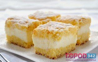 3. Суфле: Охлажденные белки взбиваем с 250 гр. песка. Творог подрумяниться, вытаскиваем и покрываем сбитым белком. Суфле выдерживаем в духовке 15 мин. Вытаскиваем пирог, разрезаем его горячим.