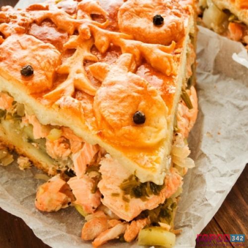 Поместите пирог на противень. В отдельной посуде взбейте яйца и сливки до получения однородной массы. Эту смесь вылейте на пирог сверху рыбы и выпекайте в течение 35 минут в духовке. Пирог должен немного «подняться», а на его поверхности – образоваться золотистая корочка.