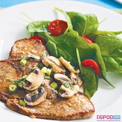 Добавьте грибы, готовьте 3-4 минуты. Выложите стейки в сковороду и дайте кускам покрыться соусом. Подавайте с луком, грибным соусом, а также с петрушкой.